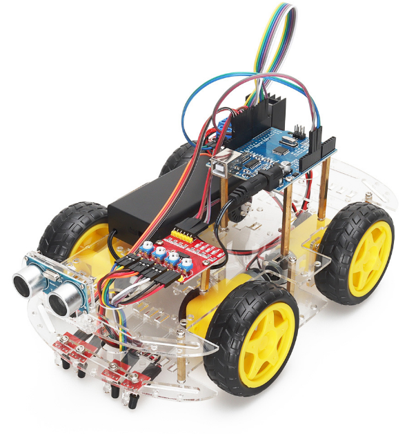 4WD smart robot car, Arduino car kit, line tracking robot, ultrasonic avoidance, infrared sensor robot, servo steering robot, Bluetooth control car, Wi-Fi module robot, PWM motor driver, STEM robot kit, programmable car, educational robotics, DIY robot kit, ultrasonic ranging, PID control, classroom robot, coding car, C programming robot, Scratch robot, Mixly project, safe voltage 6–9V, maker education, smart navigation robot, engineering project kit, autonomous car, sensor fusion robot, obstacle detection robot, mechanical robot car, school robotics kit, electronics education