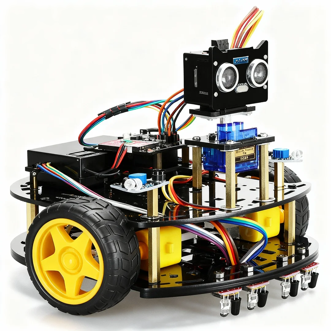 The ultrasonic distance sensor measures surroundings in real-time, enabling the robot to stop or change direction before collisions occur. It teaches reactive control systems and data-driven navigation, similar to automotive radar technology.