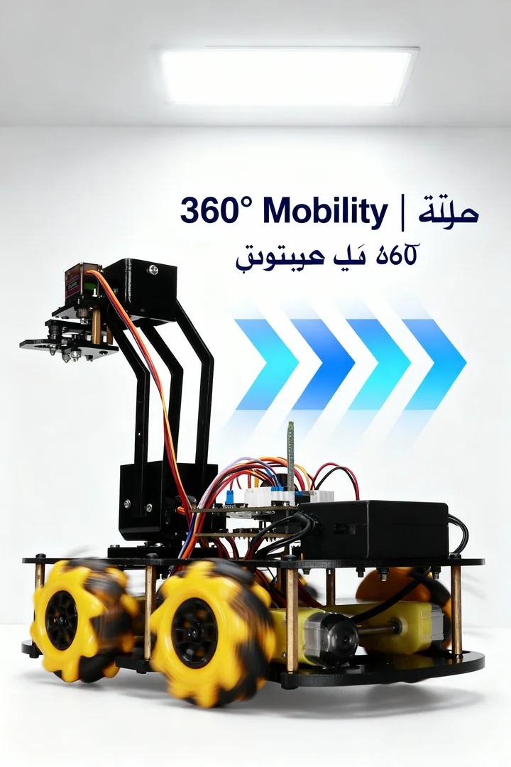నాలుగు అధిక-నాణ్యత మెకానమ్ చక్రాలతో అమర్చబడిన ఈ రోబోట్ పూర్తి 360° కదలికను సాధిస్తుంది—ముందుకు, వెనుకకు, పక్కకి, వికర్ణంగా మరియు స్థానంలో తిరిగేలా చేస్తుంది. ఈ నిర్మాణం పారిశ్రామిక AGV మరియు గిడ్డంగి రోబోట్లను అనుకరిస్తుంది, ఖచ్చితమైన నావిగేషన్ మరియు మోషన్-వెక్టర్ సంశ్లేషణను అనుమతిస్తుంది. ప్రతి చక్రం PWM వేగ నియంత్రణ మరియు PID ఫీడ్బ్యాక్తో కూడిన ఎన్కోడర్ మోటారు ద్వారా నడపబడుతుంది, ఇది ఖచ్చితమైన వేగం, టార్క్ మరియు స్థిరత్వాన్ని అందిస్తుంది. ఓమ్ని-మోషన్ సిస్టమ్ విద్యార్థులు యాంత్రిక కైనమాటిక్స్, క్లోజ్డ్-లూప్ నియంత్రణ మరియు డైనమిక్ బ్యాలెన్స్ అల్గారిథమ్లను అర్థం చేసుకోవడానికి అనుమతిస్తుంది. యాంటీ-స్లిప్ రబ్బరు మరియు మెటల్ హబ్లతో, ప్లాట్ఫారమ్ టైల్స్, కార్పెట్లు లేదా చెక్క అంతస్తులపై విశ్వసనీయంగా పనిచేస్తుంది, రోబోటిక్స్ ల్యాబ్లు లేదా పోటీ ఉపయోగం సమయంలో ప్రొఫెషనల్-స్థాయి చలన స్థిరత్వాన్ని నిర్ధారిస్తుంది.
