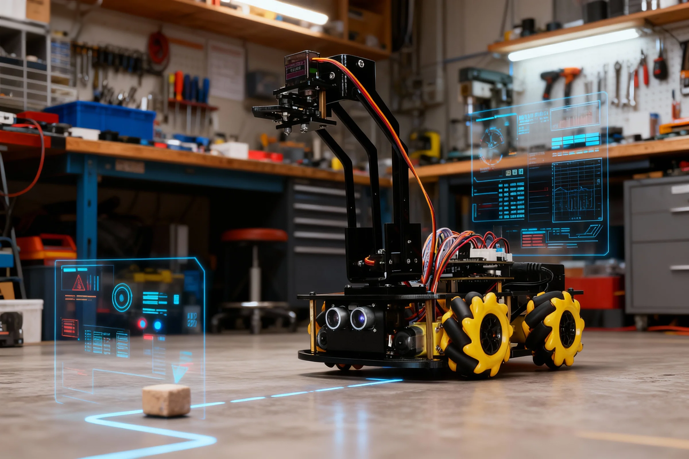 మెకానమ్ వీల్ నిర్మాణం వెక్టర్ కాంబినేషన్ కంట్రోల్ ఉపయోగించి ప్రతి దిశలో కదలికను అనుమతిస్తుంది, వాస్తవ-ప్రపంచ రోబోటిక్ నావిగేషన్ మోడల్లను అనుకరిస్తుంది. ప్రతి చక్రం యొక్క ఎన్కోడర్ క్లోజ్డ్-లూప్ PID నియంత్రణ కోసం అభిప్రాయాన్ని అందిస్తుంది, స్థిరమైన చలన ఖచ్చితత్వాన్ని నిర్ధారిస్తుంది. రోబోటిక్ ఆర్మ్ను విజువల్ మాడ్యూల్తో సమన్వయం చేసుకోవడానికి ప్రోగ్రామ్ చేయవచ్చు, “AI చూస్తుంది, చేయి పనిచేస్తుంది” వర్క్ఫ్లోను ఏర్పరుస్తుంది. ఉదాహరణకు, కెమెరా ఎరుపు రంగు వస్తువును గుర్తించినప్పుడు, చేయి స్వయంచాలకంగా దానిని పట్టుకుని తిరిగి ఉంచుతుంది - ఇది ఇంటిగ్రేటెడ్ విజువల్ సర్వోయింగ్ సిస్టమ్ల యొక్క పరిపూర్ణ ప్రదర్శన.